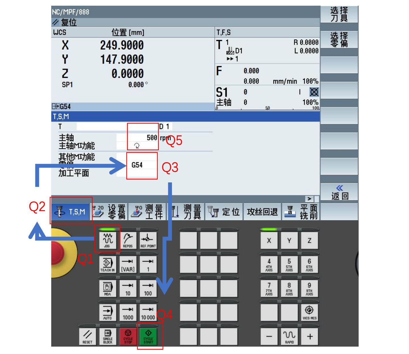 1、Q1:按JOG快移模式 Q2:T,S,M Q3:零偏選擇(G54) Q4:按啟動(dòng)鍵