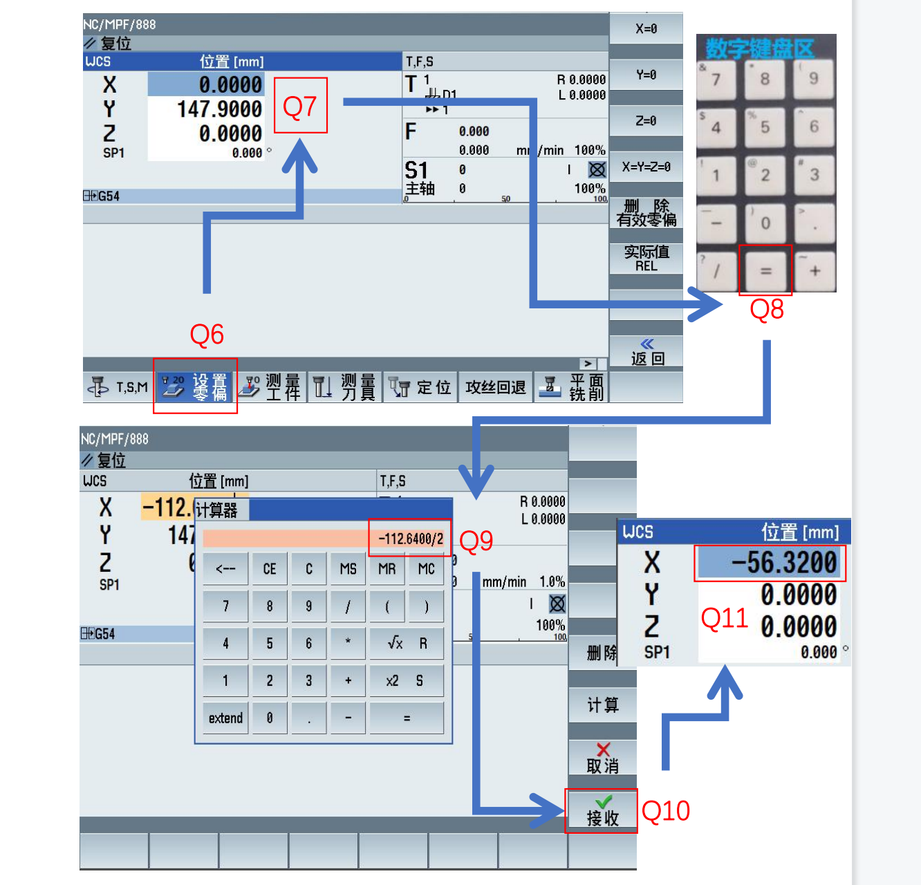Q9:出現(xiàn)計(jì)算機(jī)/2就是當(dāng)前分中的一半 Q10:接收 Q11:當(dāng)前X軸分中就已經(jīng)輸?shù)紾54坐標(biāo)里