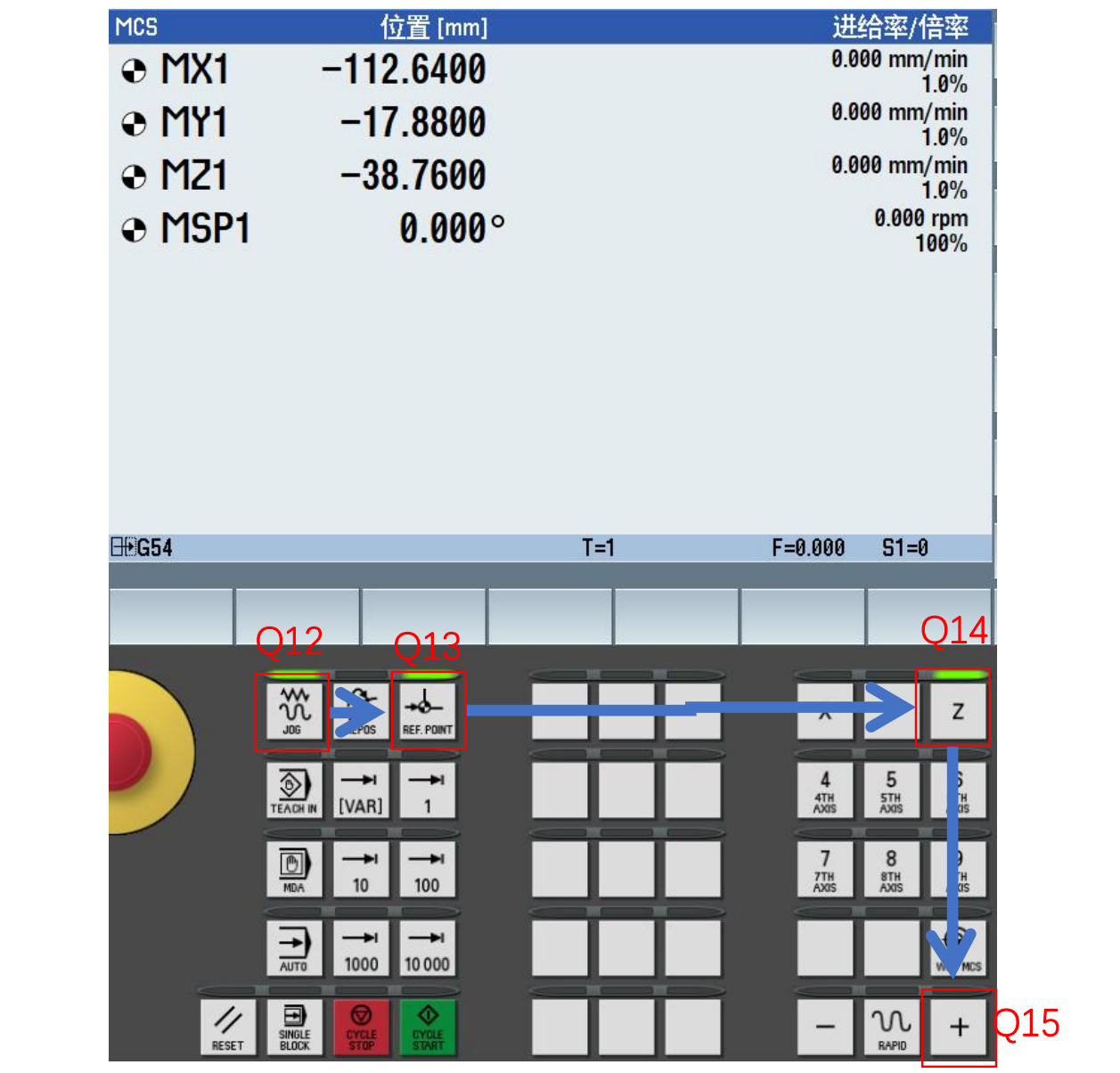 3、Q12:按JOG快移模式 Q13:REF.POINT回零 Q14:按Z軸 Q15:+ Z軸回歸安全位置
